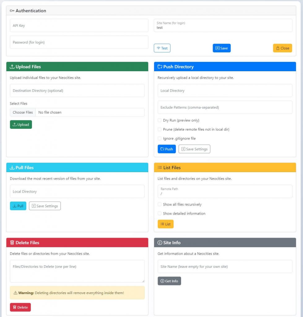 I love Neocities for its simplicity, but managing files from the command line or browser can get tedious—especially when juggling multiple sites or needing to upload folders recursively.